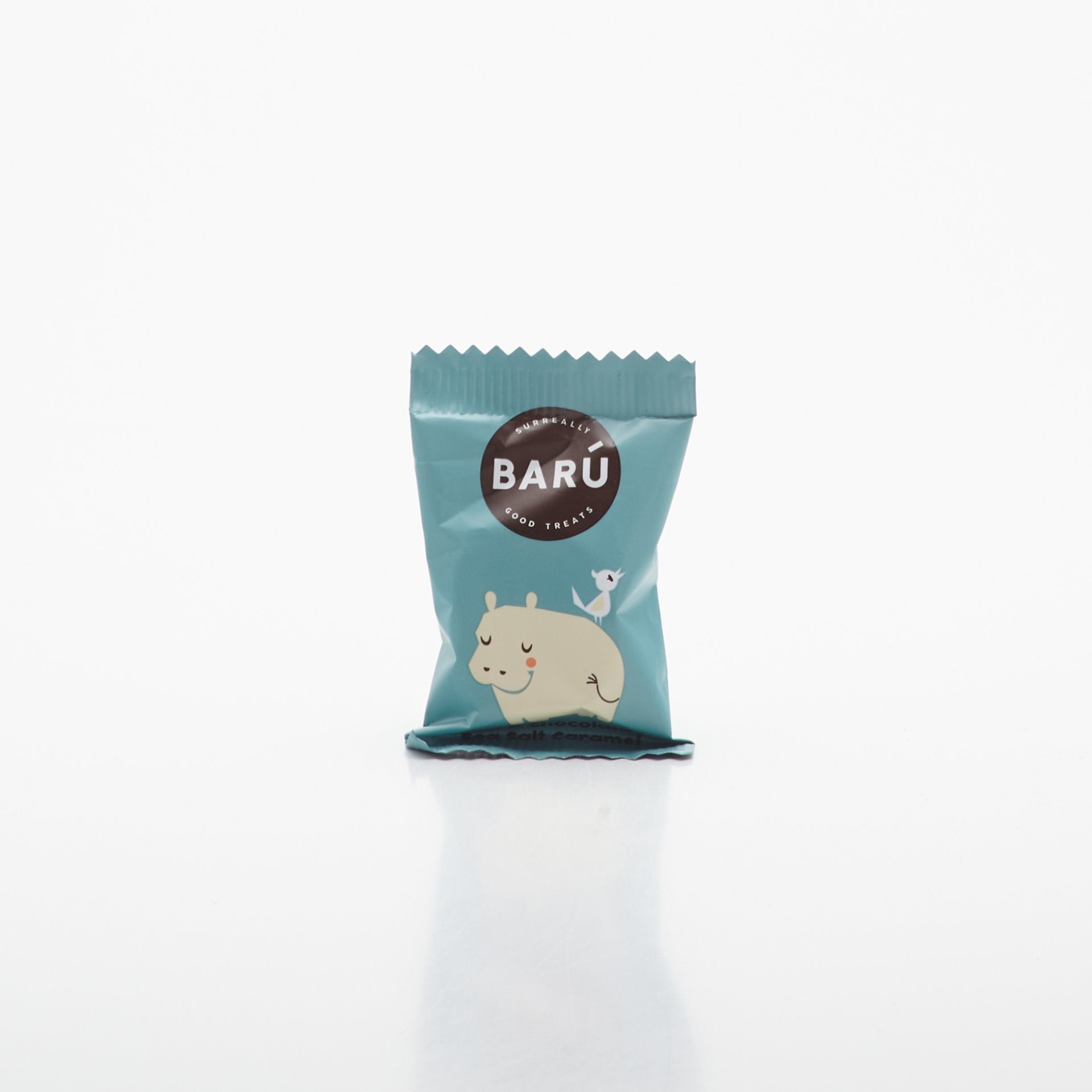 Horká čokoláda v tvare hrošíka plnená karamelom s fleur de sel soľou.
