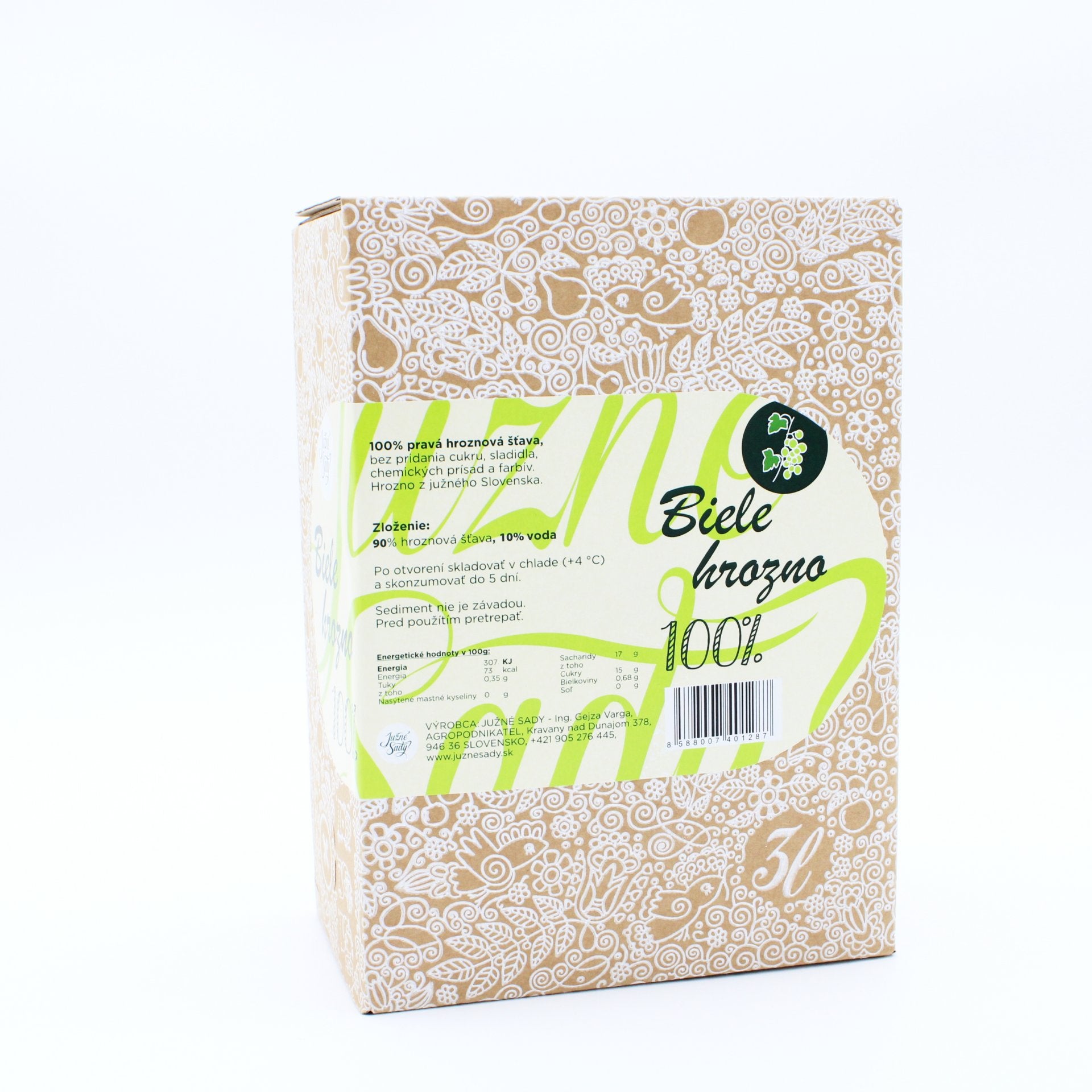 100% prírodná hroznová šťava, neriedená vodou, bez chemických prísad a farbív. Hrozno z vlastných ovocných sadov pestované v systéme integrovanej produkcie. Šetrná pasterizácia.